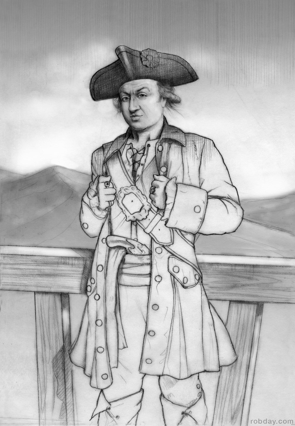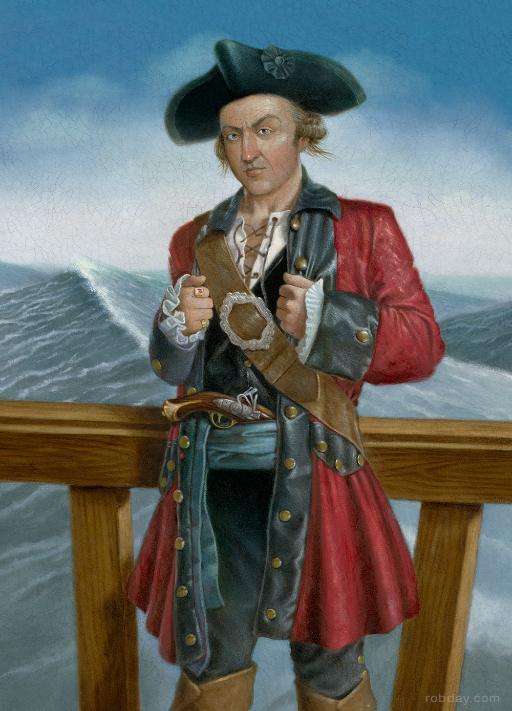 Oil on paper illustration of Captain Kidd created for the Children's Museum of Indianapolis, National Geographic Treasures of the Earth exhibit. The image is used for all of the exhibit branding including print, electroninc and signage.