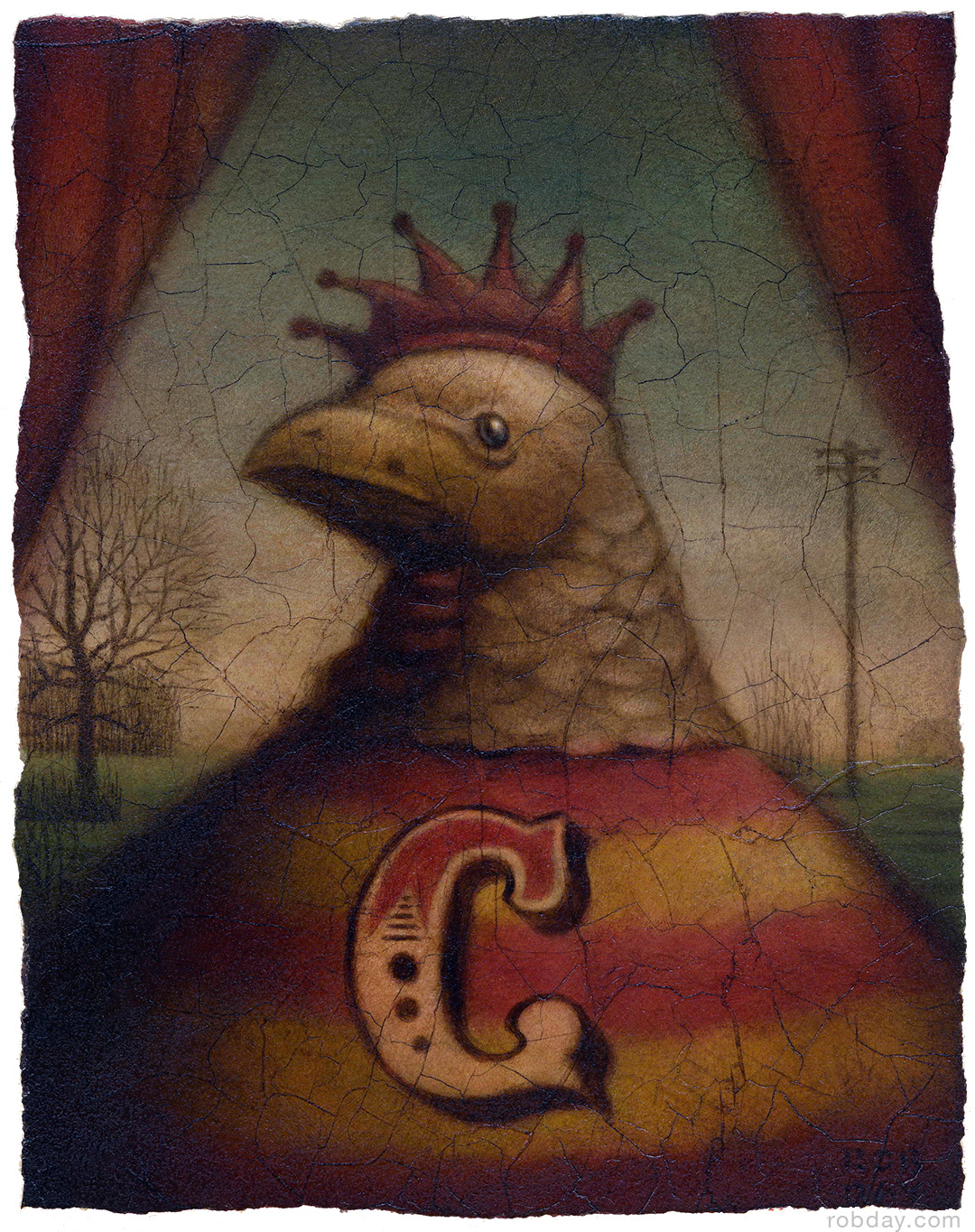 King Chicken, oil painting on gessoed paper with crackle varnish, 8'X10"